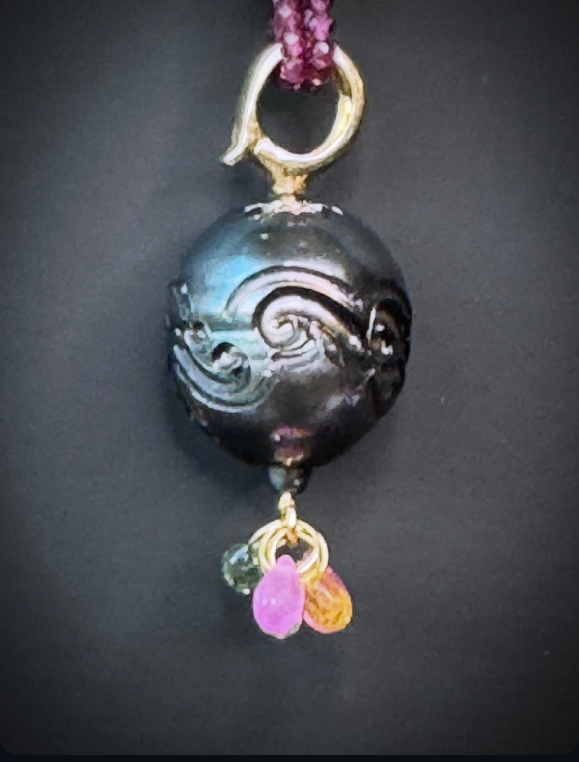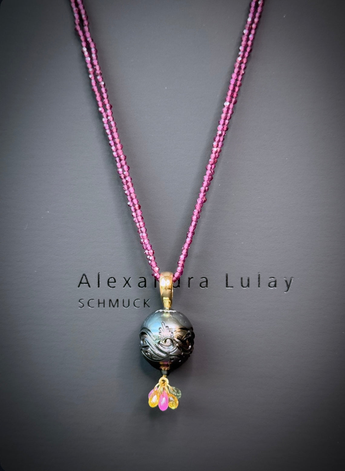 Dieser Halsschmuck ist eines meiner Lieblingsstücke! Die kunstvoll gravierte Tahitiperle mit zartem rosa Überton habe ich mit 6 kleinen facettierten Saphirtröpfchen in verschiedenen Farben kombiniert. Als Kette habe ich eine facettierte, violette Rhodolitkette gewählt, die lang oder mit einem Kettenclip doppelt kurz getragen werden kann. Die Clipöse des Anhängers ermöglicht es Dir, die Perle sowohl in die kurze, als auch in die lange Kettenvariante einzuhängen.