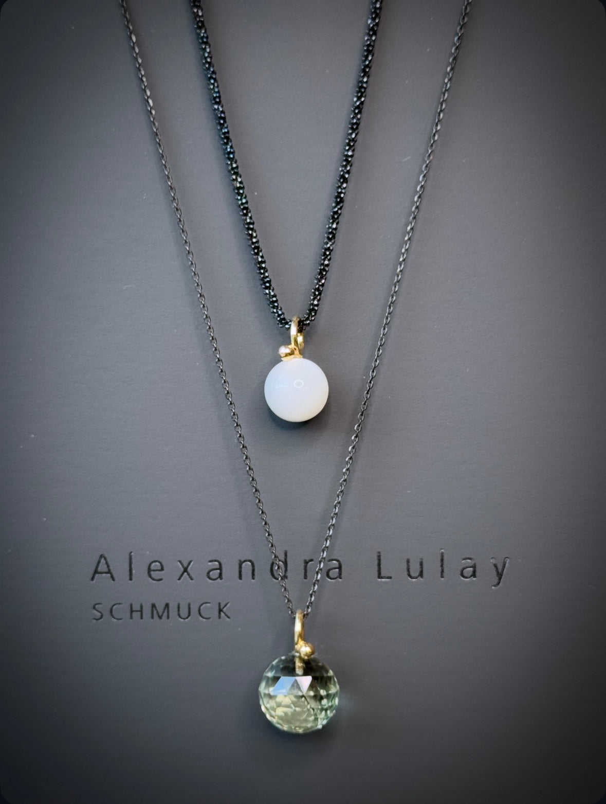 Alle Anhänger aus der „Kugel“ Kollektion sind mit einem kleinen Kügelchen aus 750/- Gelbgold versehen, wie auch diese Kugel aus hellgrauem Mondstein.