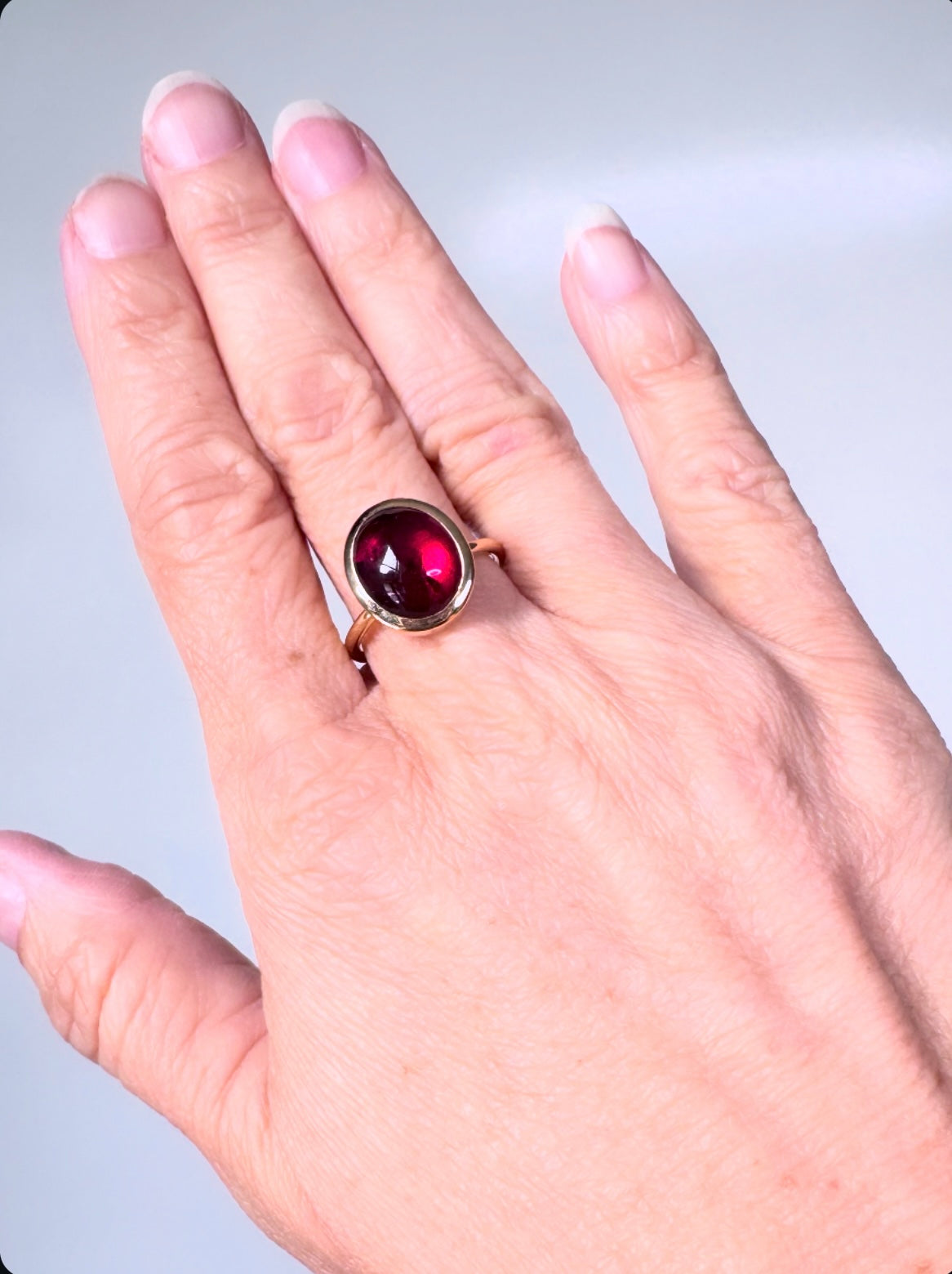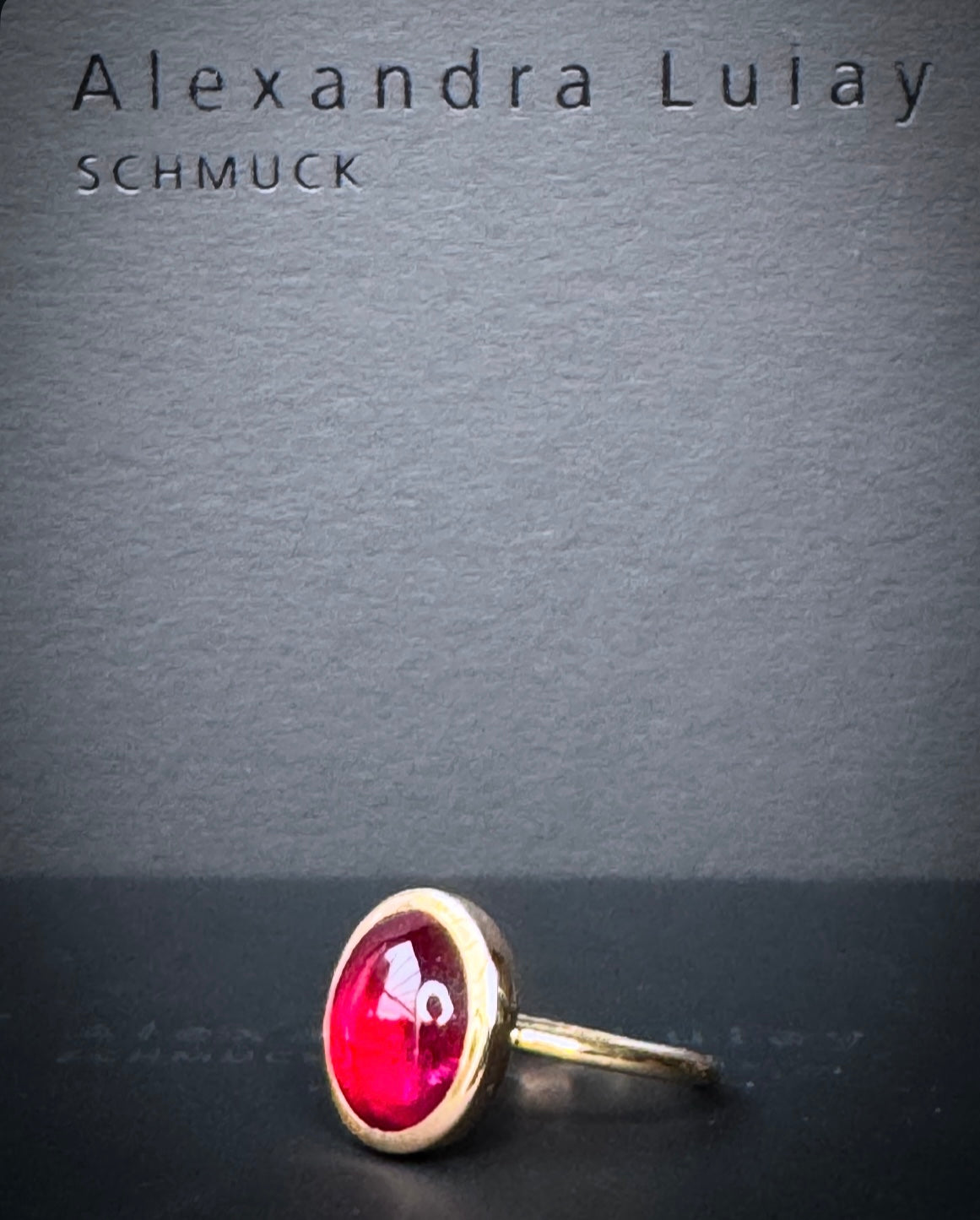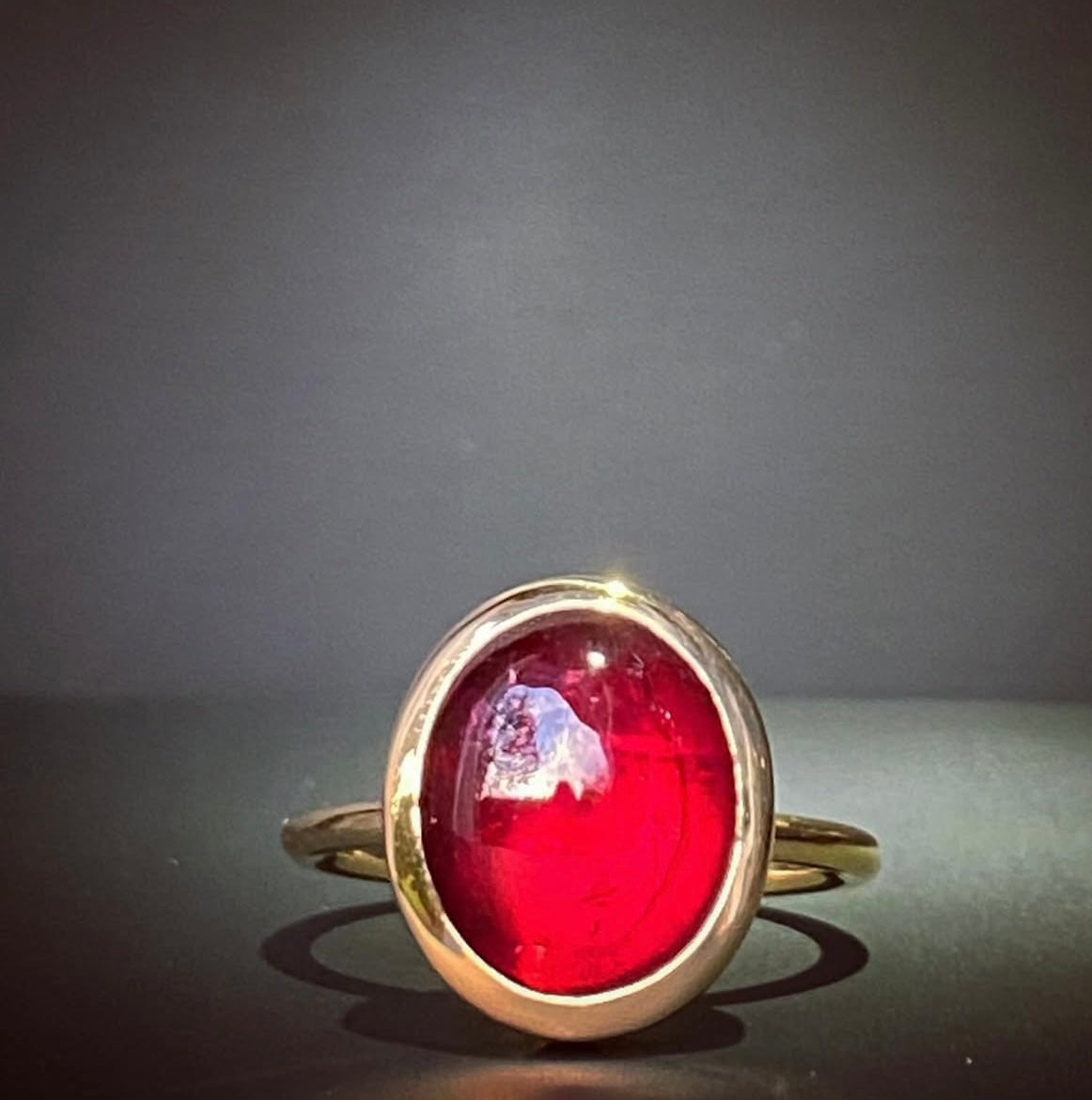 Durch das schlichte und zurückhaltende Design des Ringes, steht das intensive Rot des Turmalincabochons im Mittelpunkt! Die Ringschiene sowie die Steinfassung habe ich in 750/- Roségold gefertigt.